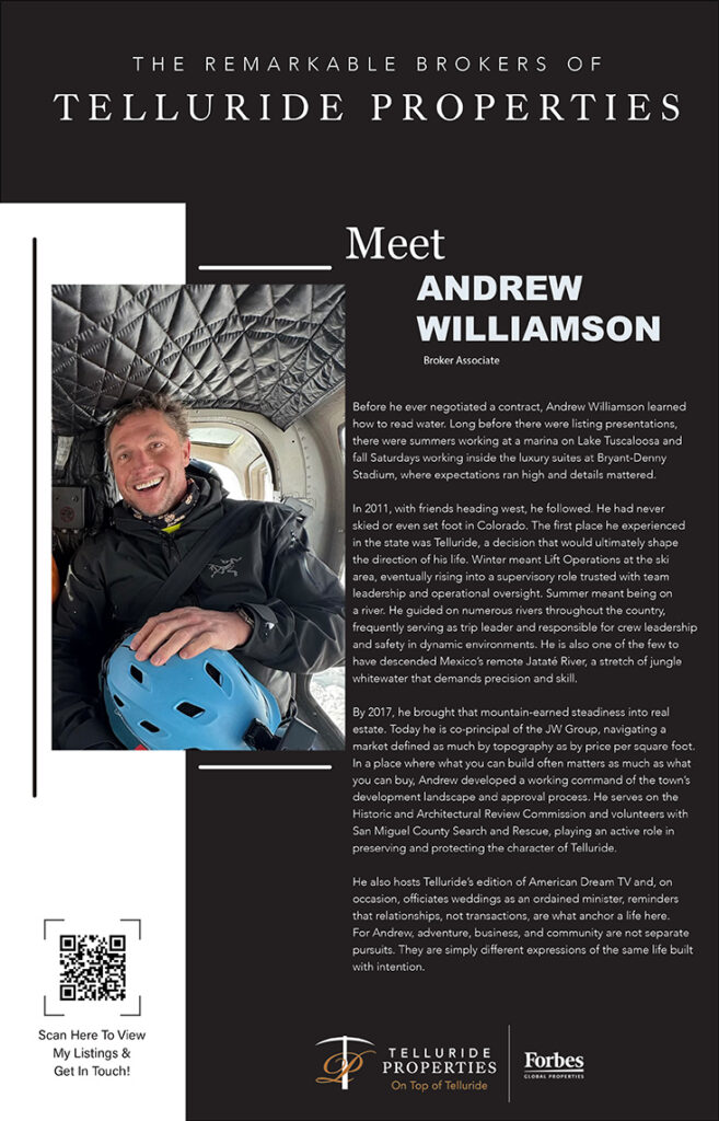 05 Mar Meet the Remarkable Brokers of Telluride Properties: Andrew Williamson Posted at 16:40h in Real Estate, Travel by admin 0 Comments 0 Likes Tags: Luxury Lifestyle, Luxury Real Estate, Mountain Homes, Telluride Colorado