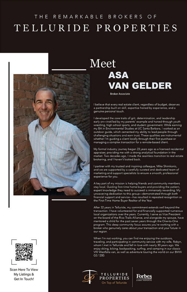 30 Nov Meet the Remarkable Brokers of Telluride Properties: Asa Van Gelder Posted at 02:06h in Real Estate, Travel by admin 0 Comments 0 Likes Tags: Luxury Lifestyle, Luxury Real Estate, Mountain Homes, Telluride Colorado