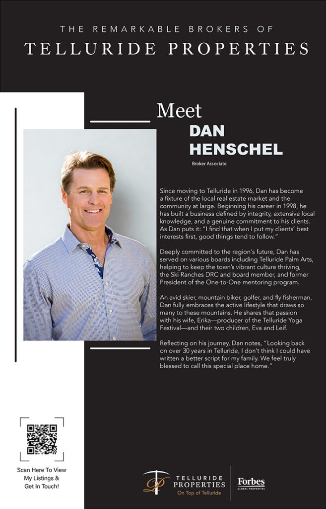 01 Jan Meet the Remarkable Brokers of Telluride Properties: Dan Henschel Posted at 18:35h in Real Estate, Travel by admin 0 Comments 0 Likes Tags: Luxury Lifestyle, Luxury Real Estate, Mountain Homes, Telluride Colorado