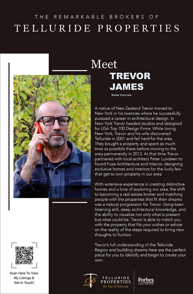 12 Oct Meet the Remarkable Brokers of Telluride Properties: Trevor James Posted at 20:40h in Real Estate, Travel by admin 0 Comments 0 Likes Tags: Luxury Lifestyle, Luxury Real Estate, Mountain Homes, Telluride Colorado
