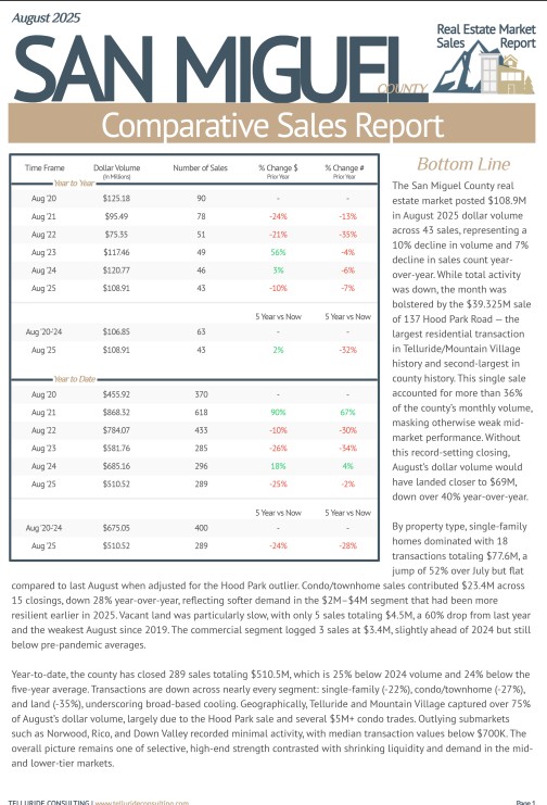 07 Aug Telluride Real Estate Report – August 2025 Posted at 21:08h in Reports by Albert Roer 0 Comments 0 Likes All data compiled and published by Telluride Consulting ©Copyright 2025. Information contained herein has been obtained from sources believed reliable, but is not necessarily complete and cannot be guaranteed, errors and omissions excepted. WE ARE STANDING BY TO ANSWER ALL YOUR QUESTIONS ABOUT TELLURIDE 970.728.0808. START SEARCHING FOR HOMES, CONDOS AND LAND HERE. Tags: Market Statistics, Telluride Real Estate