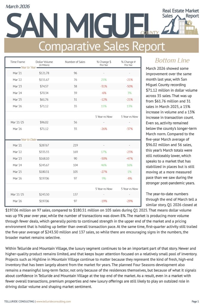 07 Apr Telluride Real Estate Report – March 2026 Posted at 21:35h in Reports by Kimberly Corrigan 0 Comments 0 Likes All data compiled and published by Telluride Consulting ©Copyright 2025. Information contained herein has been obtained from sources believed reliable, but is not necessarily complete and cannot be guaranteed, errors and omissions excepted. WE ARE STANDING BY TO ANSWER ALL YOUR QUESTIONS ABOUT TELLURIDE 970.728.0808. START SEARCHING FOR HOMES, CONDOS AND LAND HERE. Tags: Market Statistics, Telluride Real Estate