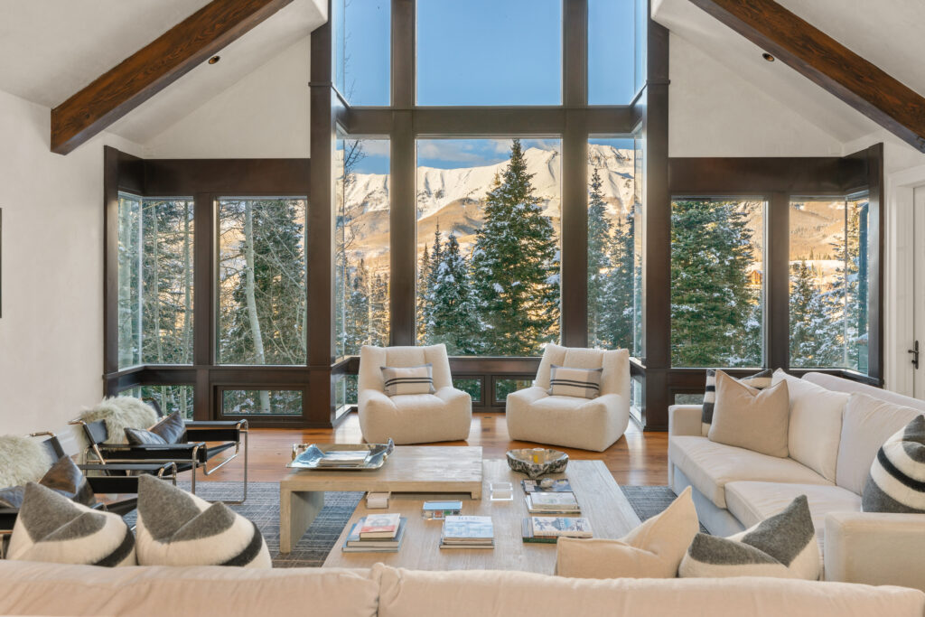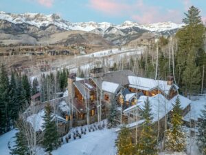 Mountain architecture can seem a bit… predictably safe. Same timbers, same stone. In Colorado, that formula reads as respect. Why steal the show from the Rockies? This Mountain Village retreat keeps a low profile outside. Sheathed in Telluride stone and weathered barn wood, the exterior tucks into the rugged slope side. Step inside and that subtlety gives way to statement. Walnut flooring, Venetian-plaster wall treatments, Jerusalem limestone surfaces. Clerestory trusses loft the great room and cinematically frame the San Sophia Range. Ditto for amenities. Three elevator-served levels hold a wine room, bar, infrared-light sauna, ski room and an oversized heated patio crowned by a custom stone hot tub. Ski-in/ski-out is effortless, thanks to a dedicated easement off Lower Galloping Goose.